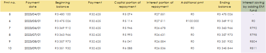 When your emergency fund sits in your access bond, it is treated as a capital repayment. This reduces the amount you owe on your home loan, lowers the interest charged, and allows more of each monthly repayment to go toward paying off your bond. See table 3 above.