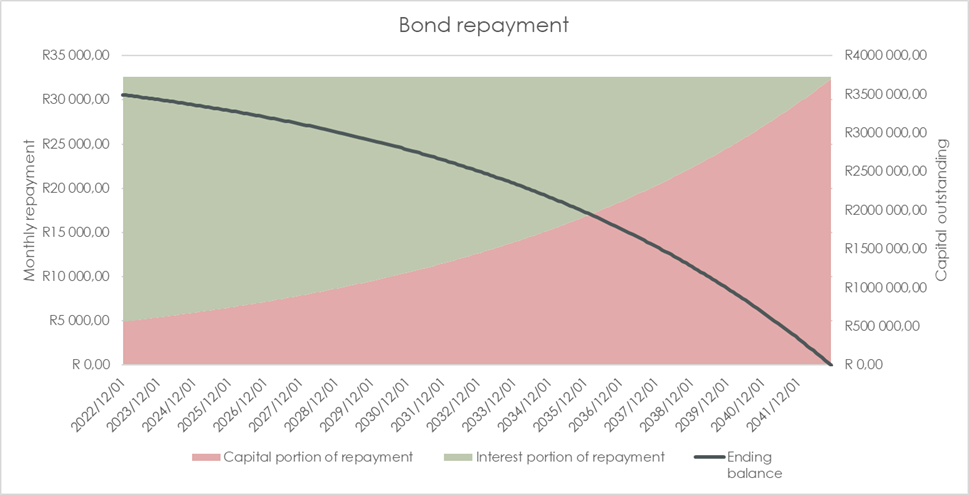 So, while your monthly repayment stays the same over the life of the bond, the split between interest and capital changes. See below: